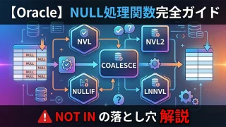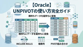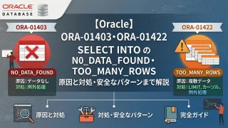 Oracle MERGE文(UPSERT)を完全解説。WHEN MATCHED/WHEN NOT MATCHEDの基本構文・UPDATEのみ/INSERTのみのMERGE・Oracle独自のMERGE DELETE句・条件付きMERGE(AND句)・ORA-30926エラーの原因と対処・在庫更新や差分同期の実務パターンまで豊富なSQL例で詳しく説明します。