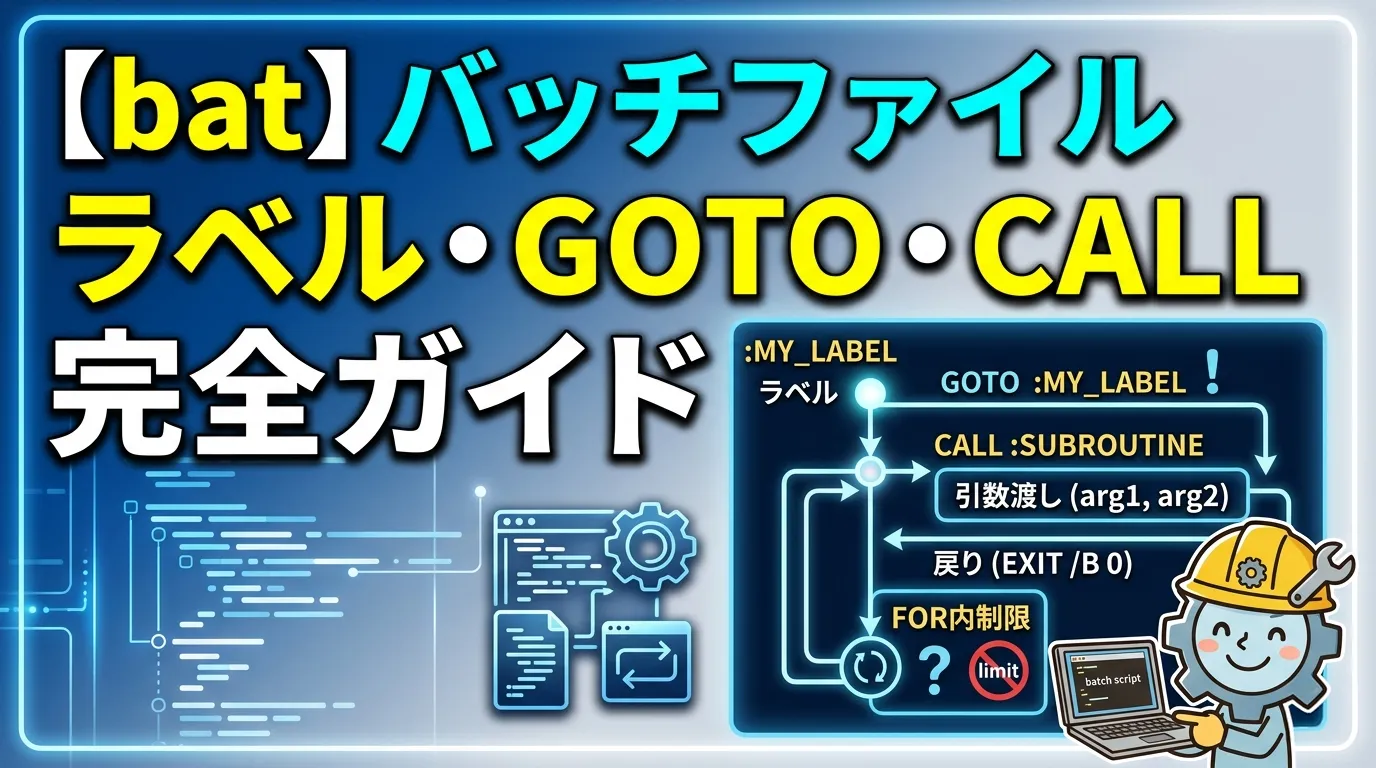バッチファイルの制御フローを支える3つの柱が ラベル(:LABEL)・GOTO・CALL です。「GOTO は悪い」と言われることもありますが、バッチファイルでは ループ・条件分岐・サブルーチン呼び出し のすべてにラベルと GOTO/CALL が登場します。本記事では命名規則・動作の違い・実務パターンを体系的に解説します。