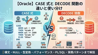 OracleのCASE式とDECODE関数の違いと使い分けを完全解説。単純CASE/検索CASEの構文、CASE vs DECODE完全比較表(NULL扱い・型変換・パフォーマンス・SQL標準・PL/SQL対応)、NULLの等値判定の違い、暗黙型変換の罠、PL/SQLでのCASE文、ORDER BY/GROUP BY/UPDATE/INSERT内でのCASE実務パターンまで網羅。