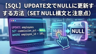 UPDATE テーブル名 SET カラム名 = NULL WHERE 条件 でNULLに更新できます。複数カラムの一括NULL化、NOT NULL制約エラーの対処、CASE文での条件付き更新、NULLと空文字の違いまで、実務で使えるSQLをコード例付きで網羅的に解説。