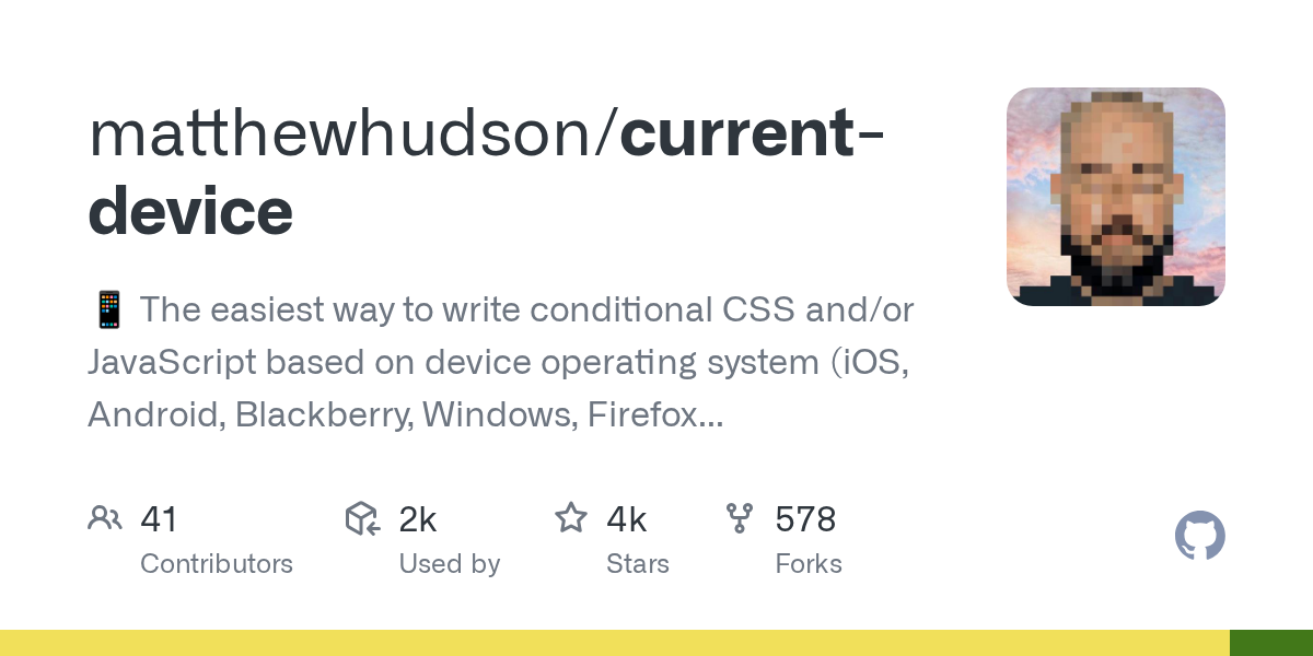 GitHub - matthewhudson/current-device: 📱 The easiest way to write conditional CSS and/or JavaScript based on device operating system (iOS, Android, Blackberry, Windows, Firefox OS, MeeGo), orientation (Portrait vs. Landscape), and type (Tablet vs. Mobile).