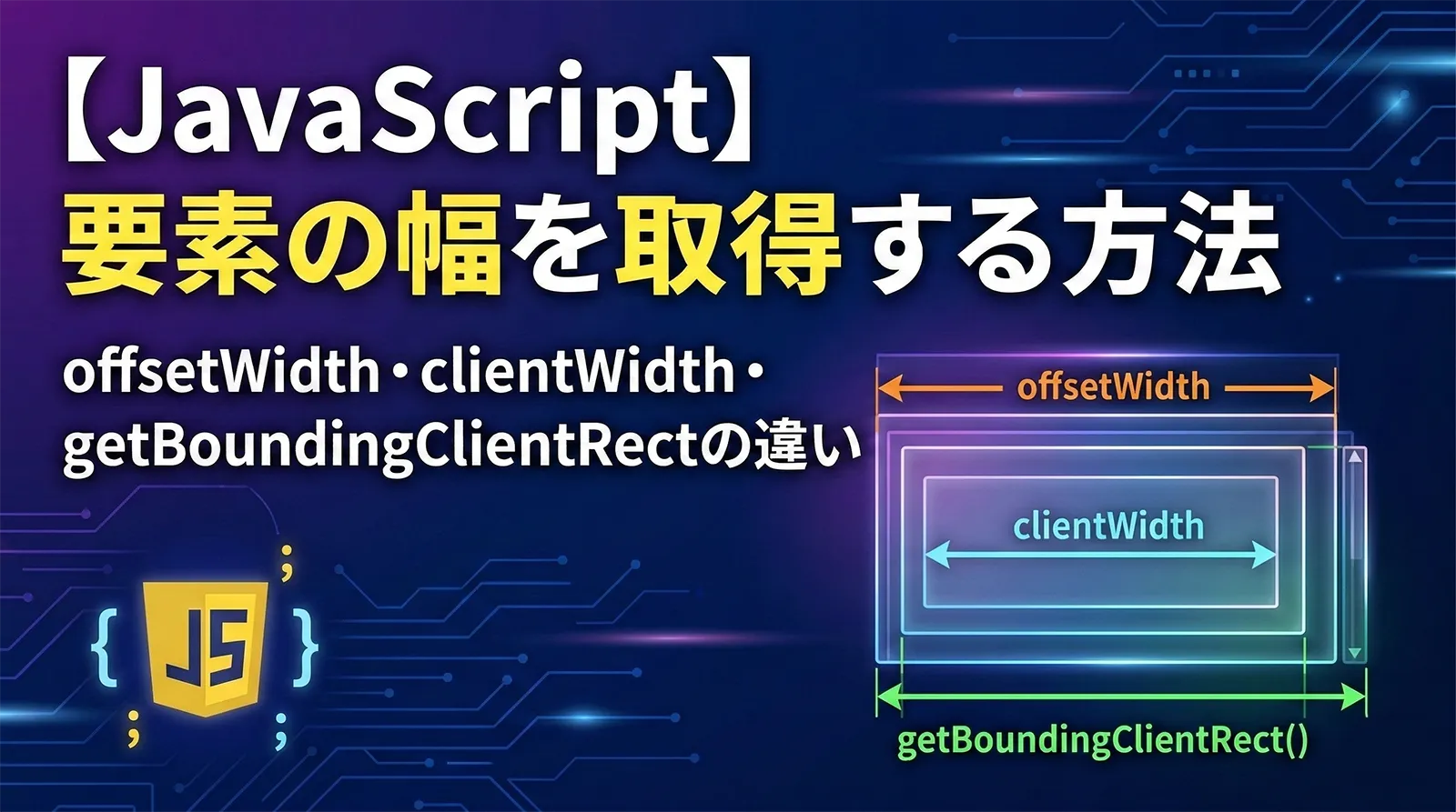 JavaScriptでHTML要素の幅を取得したいとき、使えるプロパティやメソッドは複数あります。offsetWidth、clientWidth、getBoundingClientRect()、getComputedStyle() — それぞれが返す値は微妙に異なり、どれを使うかで結果が変わることがあります。