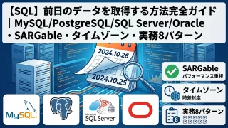 SQL 【SQL】前日のデータを取得する方法完全ガイド|MySQL/PostgreSQL/SQL Server/Oracle・SARGable・タイムゾーン・実務8パターン