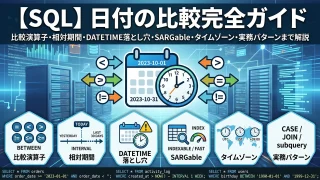 SQL 【SQL】日付の比較完全ガイド|比較演算子・相対期間・DATETIME落とし穴・SARGable・タイムゾーン・実務パターンまで解説