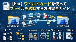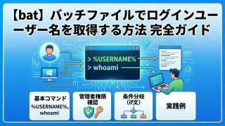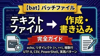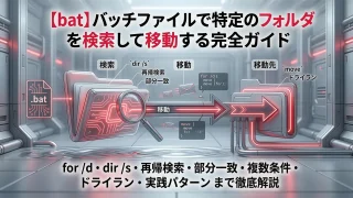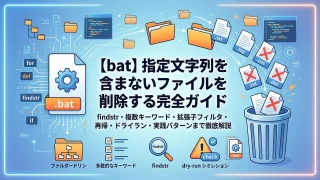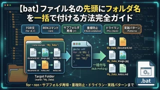 バッチファイルのIF EXISTを完全解説。ファイル・フォルダの存在確認の基本構文、フォルダ確認のNUL/末尾バックスラッシュの違い、スペース含むパスのダブルクォート対応、ELSE・ネスト・ワイルドカード活用、実践例3本(フォルダ自動作成・必須ファイル一括チェック・ロックファイル二重起動防止)付き。